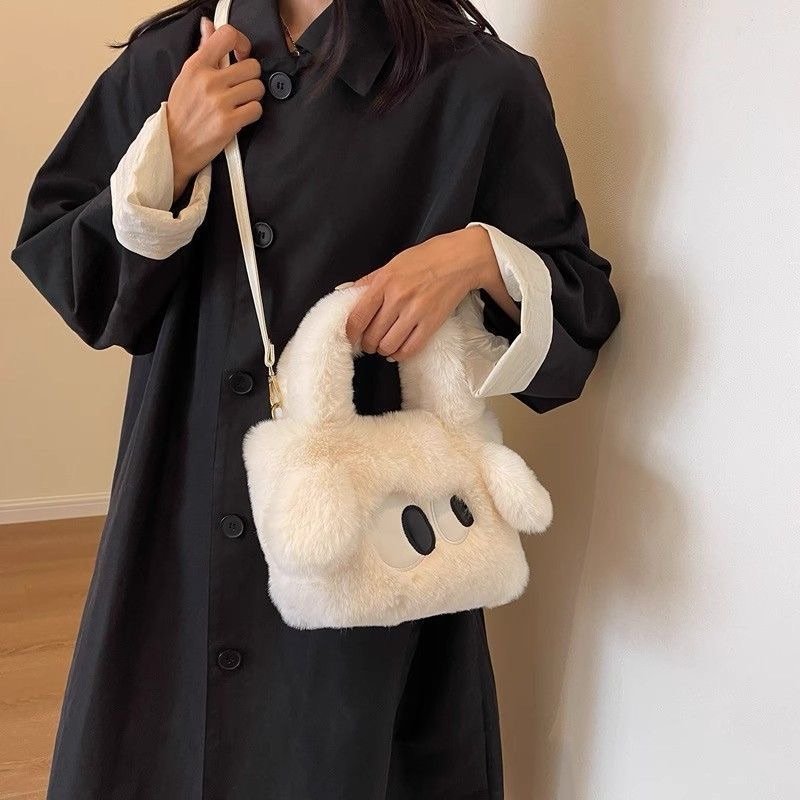 2025 Winter New Furry Bags Women’s Trendy Cute Cartoon Puppy Plush Handbag Single Shoulder Messenger Bag Small Square Bag