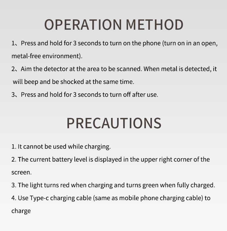 metal-free environment) 2、Aim the detector at the area to be scanned. When metal is detected, it will beep and be shocked at the same time. 3、Press and hold for 3 seconds to turn off after use. |
